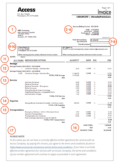 - En-têtes de facture: Qté d’articles – compte réel de boîtes Description du service – type de contenant ou de service fourni. Quantité – volume total en pied cube par type de contenant ou nombre d’articles fournis. Tarif – tarif de stockage par pied cube pour le nombre de jours dans la période de facturation ou prix par type de service. Taxe – O/N indique si la taxe s’applique. Frais – total facturé pour le poste